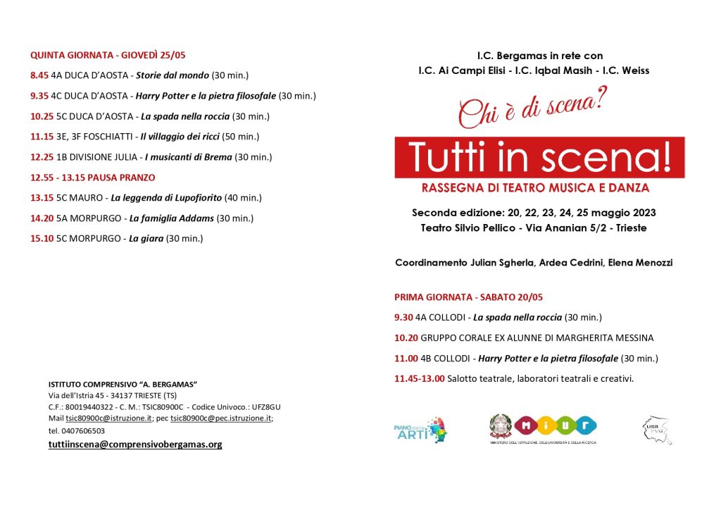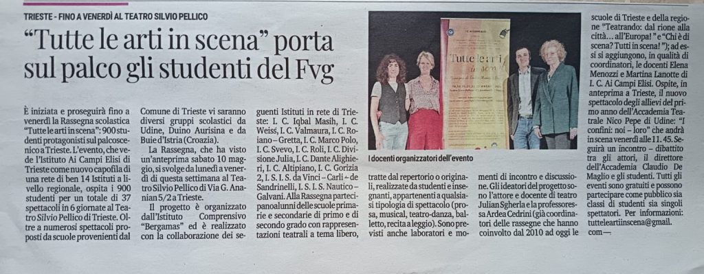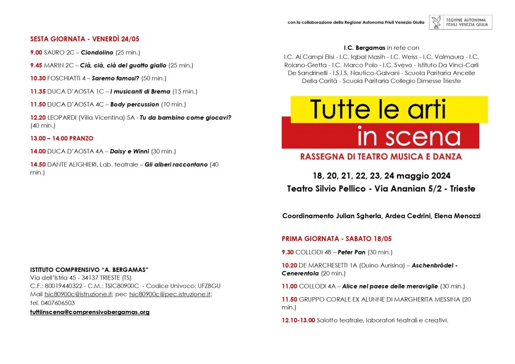 Parte sabato 18 maggio 2024 la Rassegna “Tutte le arti in scena” che vede l’Istituto Bergamas di Trieste come capofila di una rete di 11 Istituti a livello regionale.