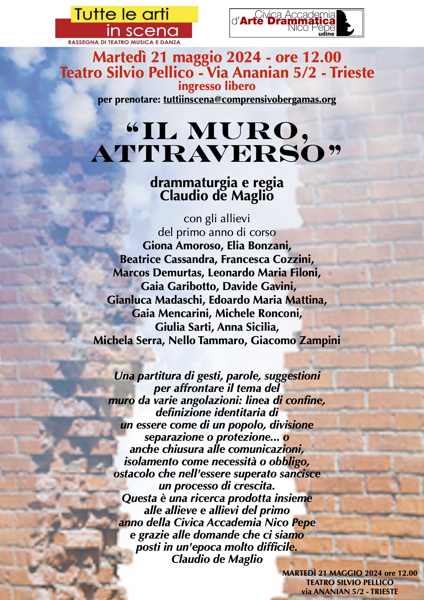 Ospite, in anteprima a Trieste, il nuovo spettacolo degli allievi del primo anno dell’Accademia Teatrale Nico Pepe di Udine “IL MURO ATTRAVERSO” che andrà in scena martedì 21 maggio alle ore 12.00.