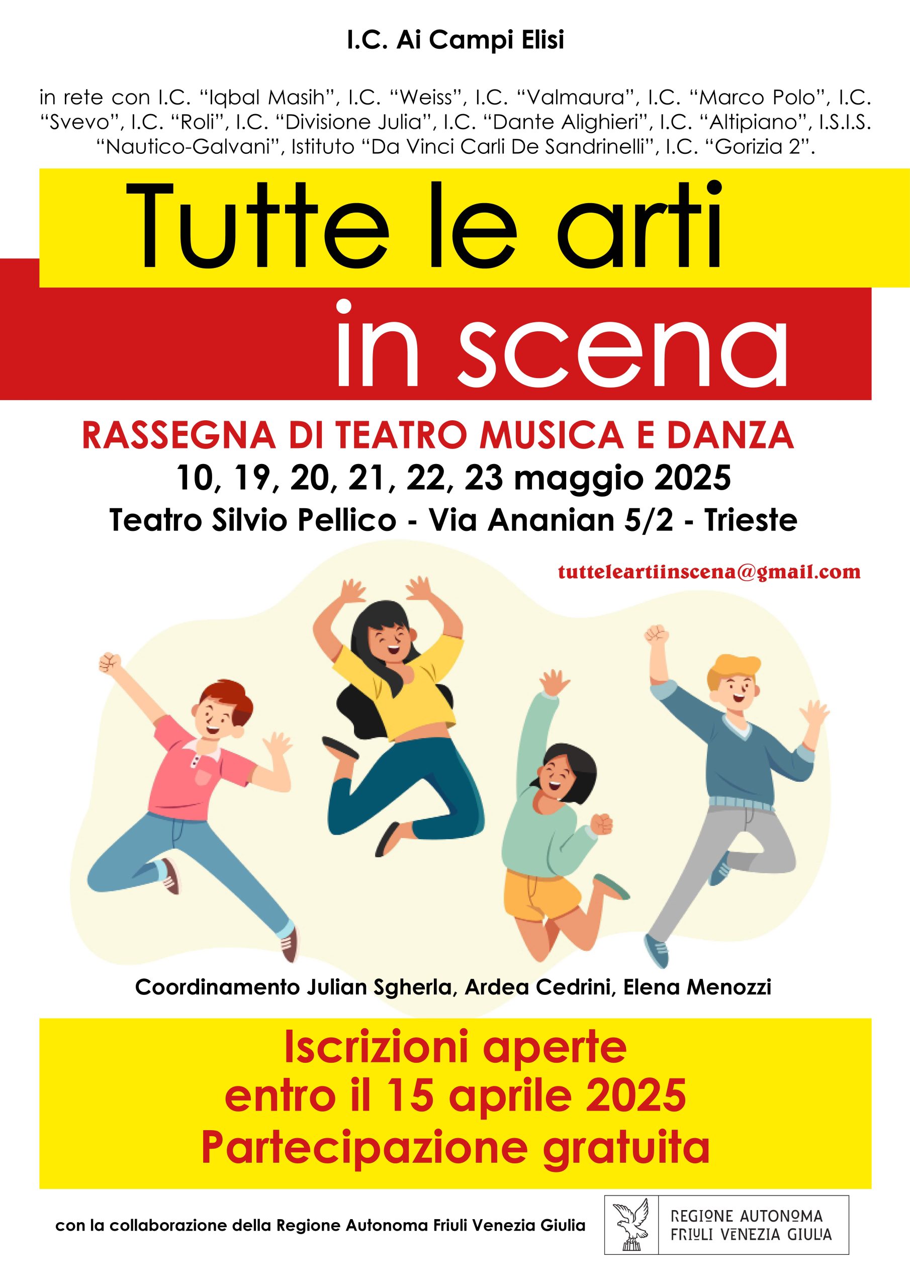 “Tutte le arti in scena” nasce dal desiderio di creare un’occasione di scambio e di confronto tra le attività teatrali realizzate dalle scuole del Friuli Venezia Giulia e vedrà coinvolti ragazzi, insegnanti, genitori, operatori teatrali, dirigenti scolastici ed esperti di teatro. Il progetto viene realizzato con la collaborazione della Regione Autonoma Friuli Venezia Giulia.