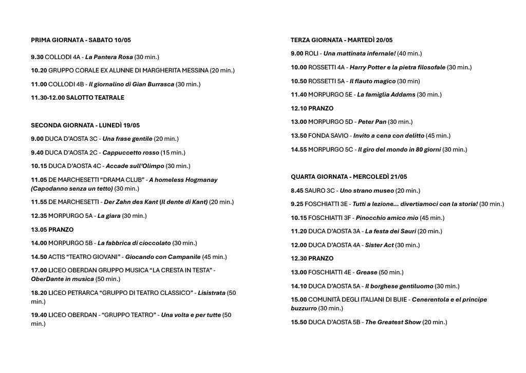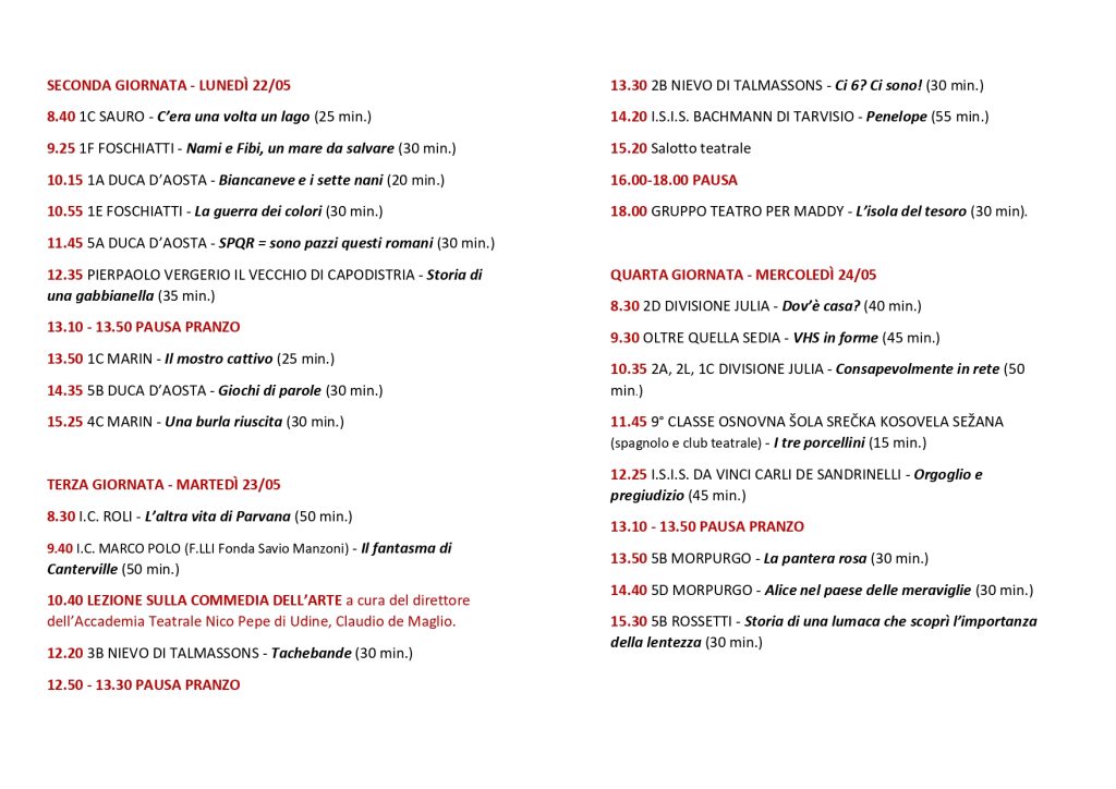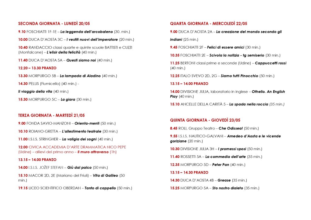La Rassegna ospiterà 900 studenti per un totale di 40 spettacoli in 6 giornate al Teatro Silvio Pellico di Trieste. Oltre a numerosi spettacoli proposti da scuole provenienti dal Comune di Trieste vi saranno gruppi scolastici da Udine, Fiumicello, Villa Vicentina, Monfalcone e Duino Aurisina.